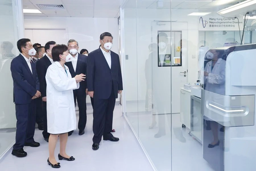 ▲2022年6月30日下午,習近平在香港特別行政區(qū)行政長官林鄭月娥陪同下,來到香港科學園考察。這是習近平在香港神經(jīng)退行性疾病中心考察。